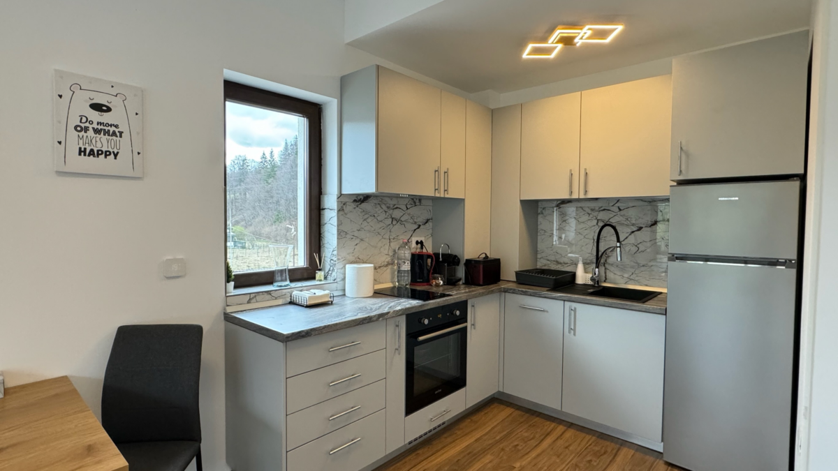 Livingul împreună cu Bucătăria constituie o zonă în suprafață de 20mp și oferă un spațiu de zi unde se poate atât găti și lua masa, dar și lucra la Biroul special amenajat, având internet de mare viteză. Canapeaua este excelentă pentru relaxare în timpul zilei, însă se poate extinde și formează o suprafață de dormit confortabilă de 140cm pentru 2 persoane pe timpul nopții. Geamurile panoramice oferă o vedere superbă către munți și Crucea Caraiman.