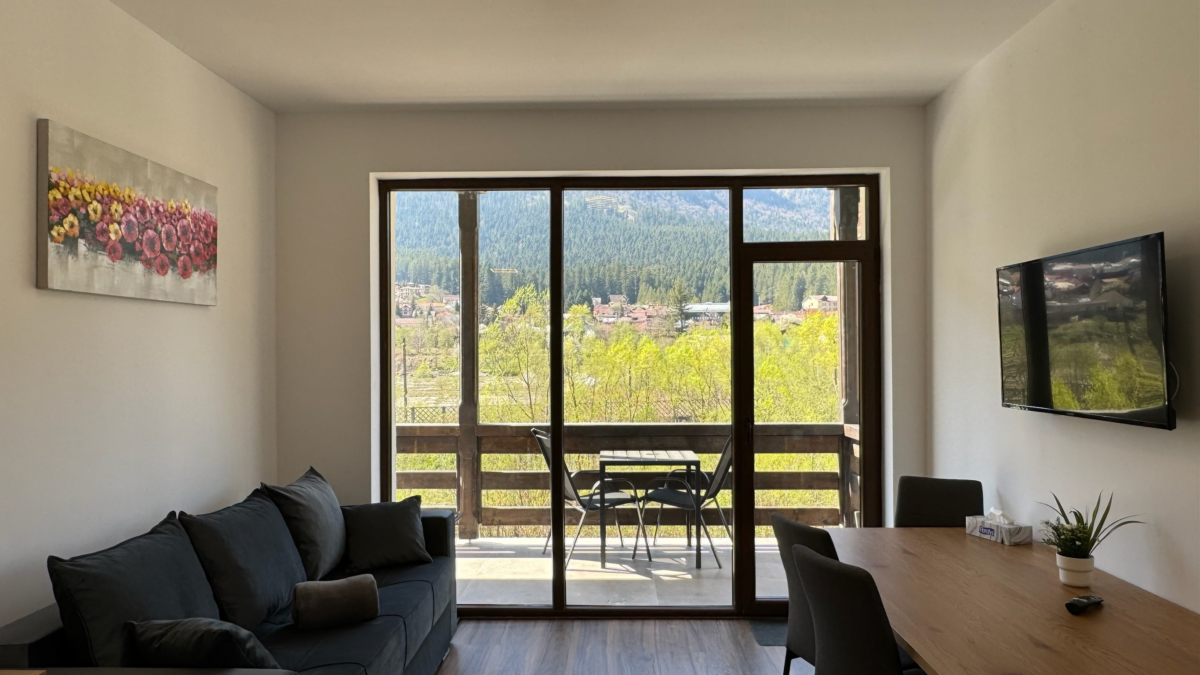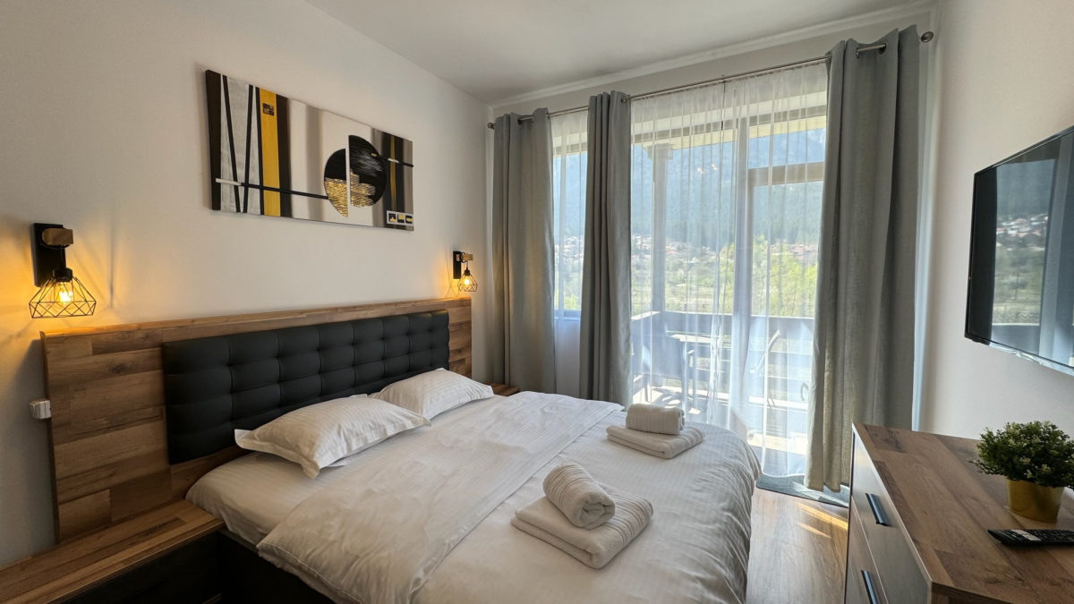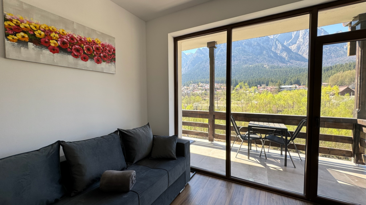 Situat pe malul râului Prahova într-o clădire nouă, cu vedere spectaculoasă asupra munților Bucegi și a crucii Caraiman, Apartamentul de 3 camere Superior este poziționat la doar 12 minute de mers pe jos față de centrul orașului Bușteni și de gara Bușteni. Sunetul apei curgând prin fața geamului este extrem de apreciat și relaxant pentru oaspeții noștri.