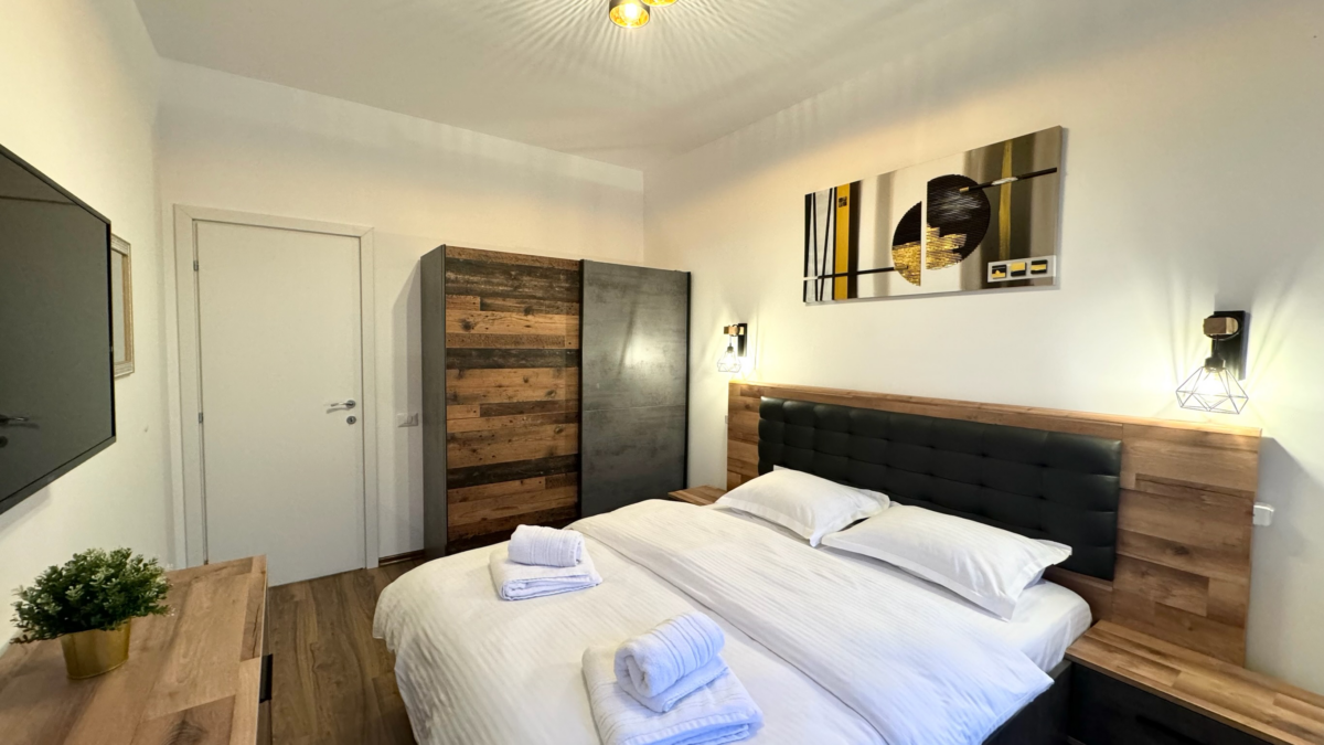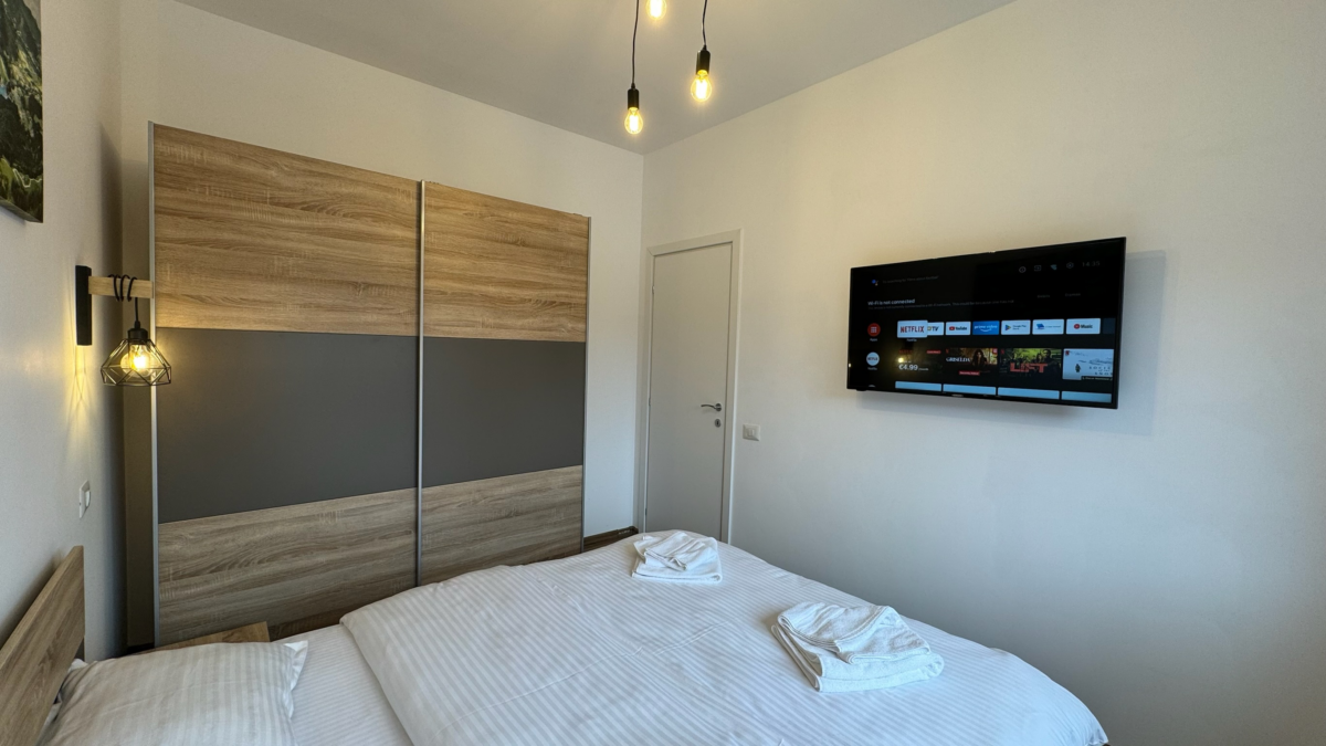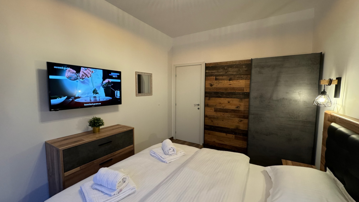 Cel de-al doilea Dormitor are o suprafață de 10mp, fiind mobilat de asemenea cu 1 pat dublu de 160cm, noptiere, șifonier, comodă TV cu sertare, televizor smart.