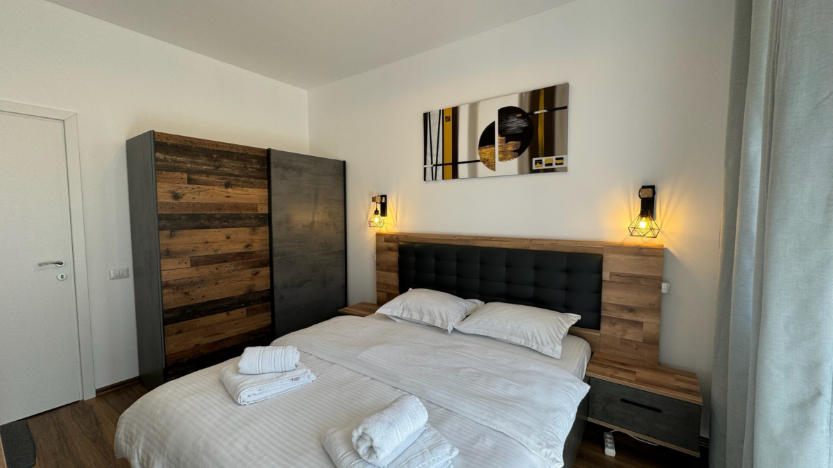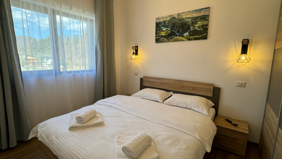 Dormitorul principal are o suprafață generoasă de 12mp, este mobilat cu 1 pat dublu de 160cm, noptiere încorporate în tablia patului, șifonier dublu cu spații multiple de depozitare, comodă TV cu sertare, televizor smart, geamuri ample cu vedere către munte, acces în balcon din cameră.