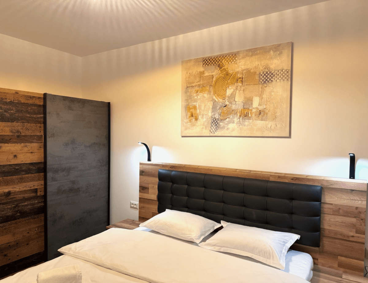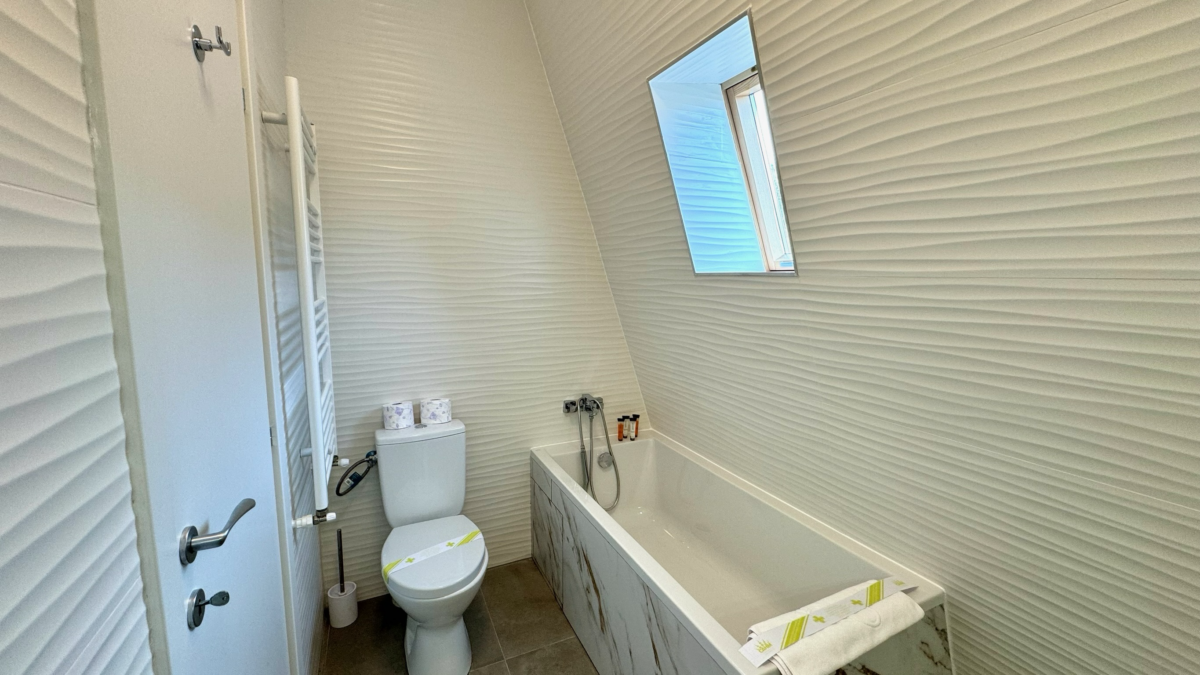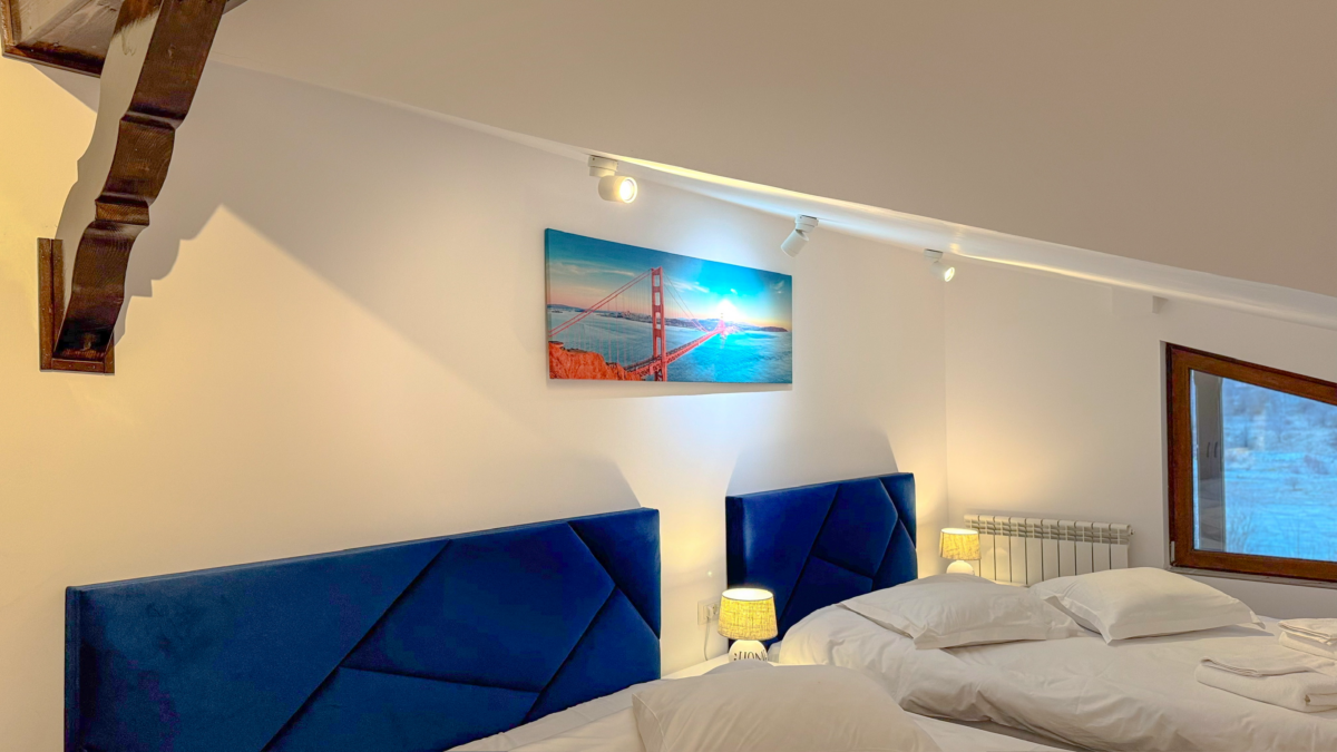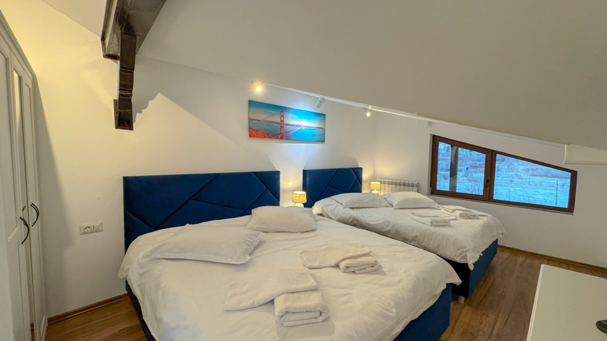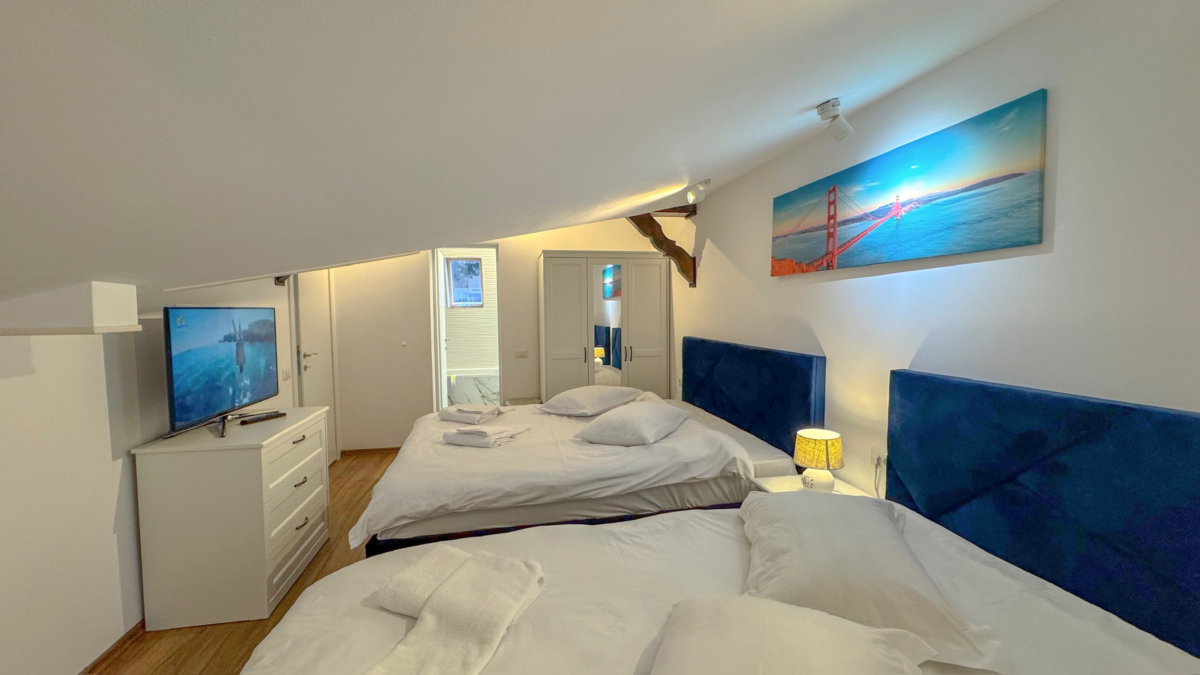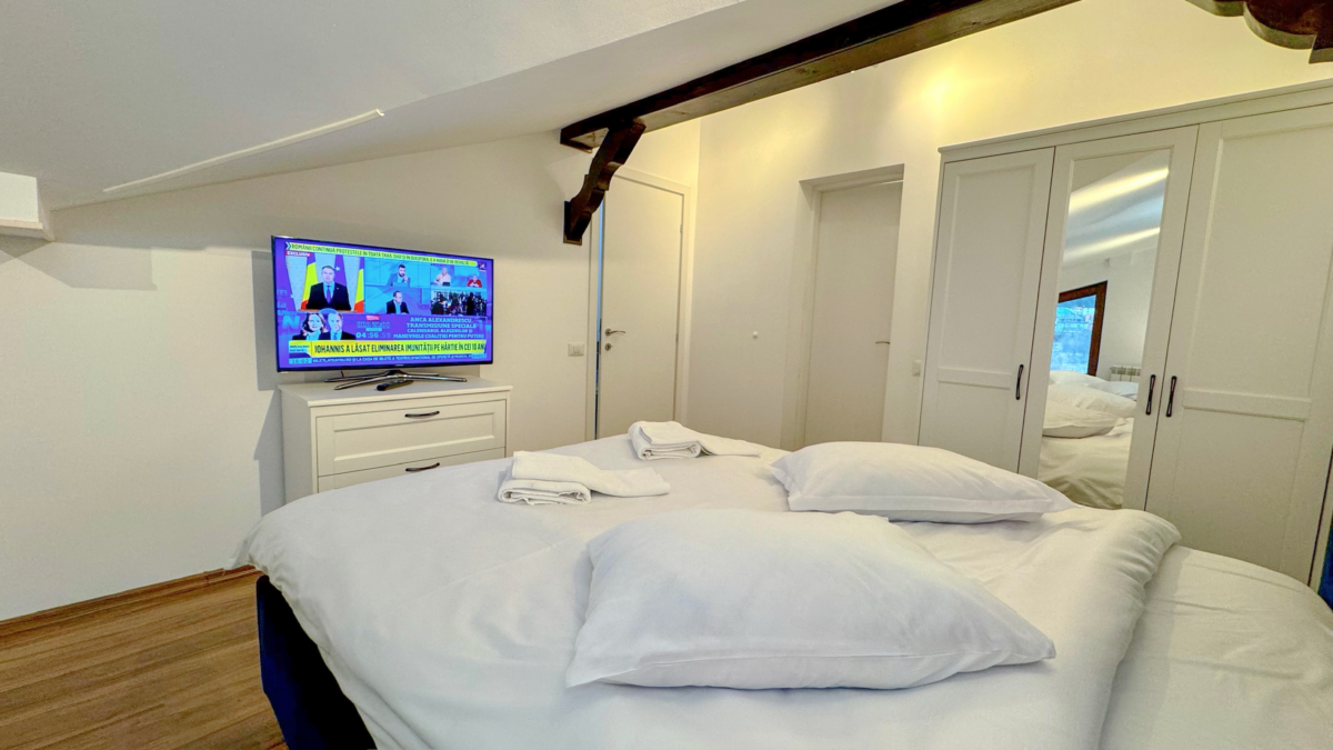 Cel de-al doilea Dormitor dublu este situat la nivelul superior și are o suprafață de 17mp, fiind mobilat cu 2 paturi duble, unul de 160cm și al doilea de 140cm, noptiere, comodă TV cu sertare, televizor smart și Baie în cameră prevăzută cu duș dar și cadă, având o suprafață generoasă de 6mp.
