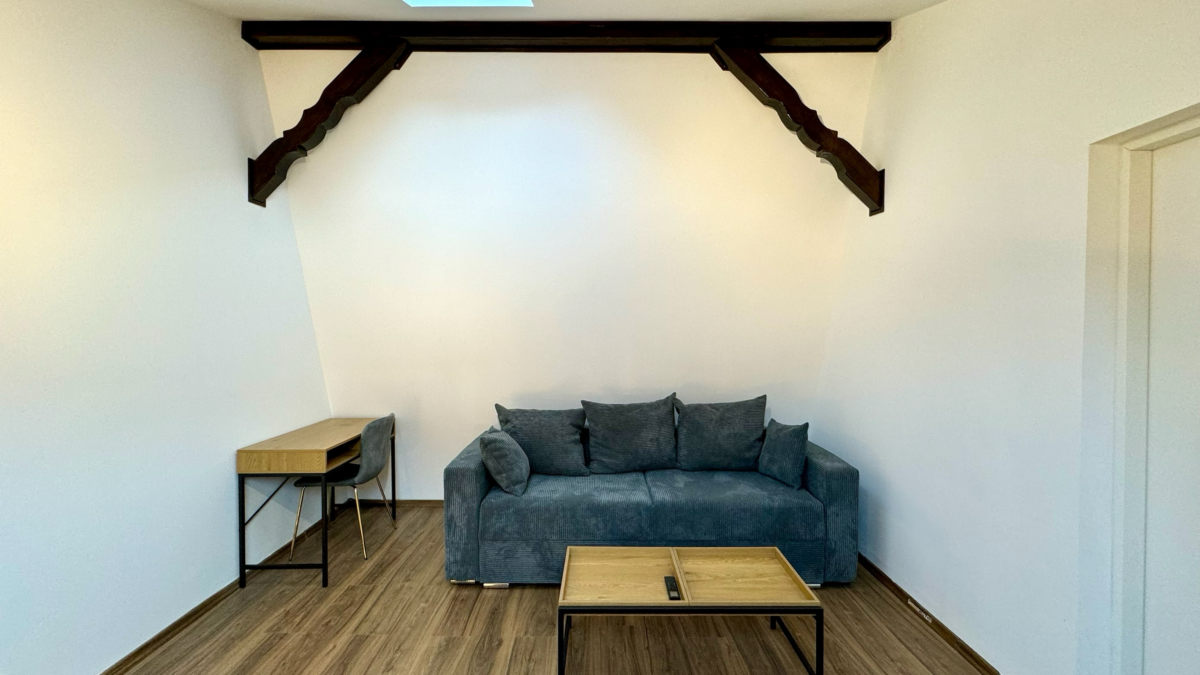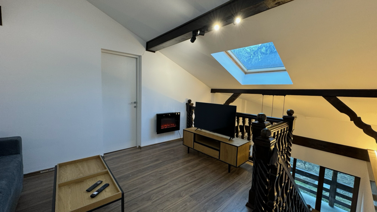 Livingul de la nivelul superior (Loft) cu o suprafață totală de 15mp este destinat ca și zonă de relaxare unde există smart TV, șemineu electric, dar se poate și lucra în liniște la Biroul special amenajat, având internet de mare viteză. Acesta este prevăzut cu o canapea extensibilă care se transformă într-un loc de dormit cu suprafața de 140cm, fiind potrivită pentru 2 persoane.