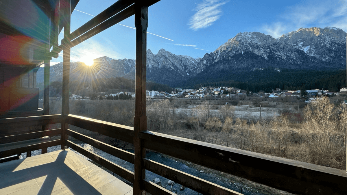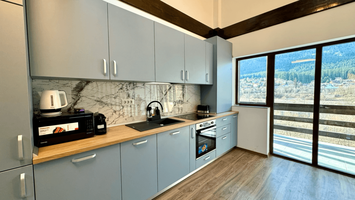 Balconul foarte spațios de 10mp este mobilat cu măsuțe și scaune de exterior unde se poate admira peisajul uluitor către munți. Am adăugat un grătar electric care se poate folosi oricând.