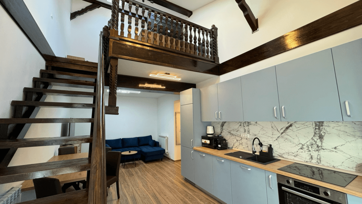Apartamentul poate caza cu ușurință până la 10 persoane, fiind construit pe 2 nivele și compartimentat în 4 Camere astfel: 2 dormitoare, 1 living cu bucătarie open space, 1 loft situat la etaj, 2 băi și 1 balcon spațios, cu intrare atât din dormitorul principal cât și din living.
